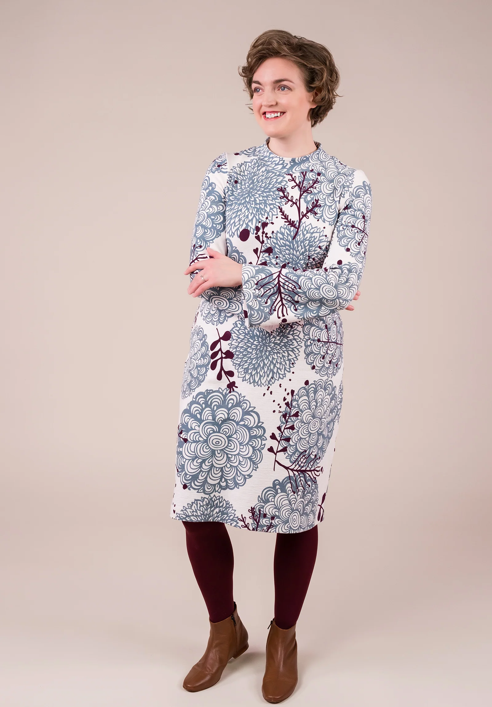 This soft and comfortable dress is a delight to wear. It is easy to make and can be adapted for various occasions by the choice of material. The burgundy version is sewn from merino-wool single jersey and the pale-color version from printed organic-cotton knit fabric. You can also use other firm knit fabrics with a slight stretch, such as sweatshirt knit, velour knit, cotton jacquard knit or Punto di Roma double-knit jersey.