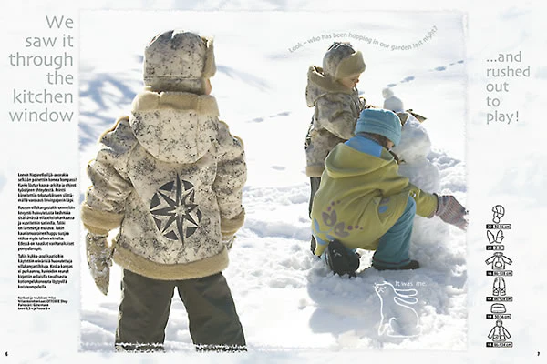 Comfy anoraks, hats, mittens and a wool coat for winter playtime. Sizes 86-134 cm.
